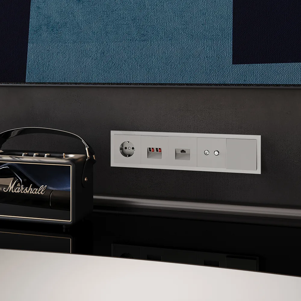 Вывод кабеля легко интегрируется в любую композицию на стене — рядом с розетками, выключателями или мультимедийными устройствами, создавая цельную, продуманную и чистую электрическую инфраструктуру.